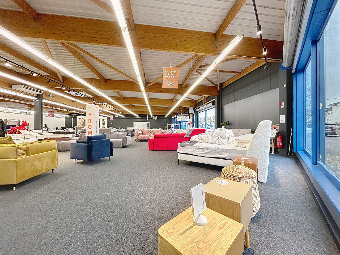 Il est composé d'un grand espace central, d'un coin bureau, sanitaire, salle de pose, d'une porte sectionnelle, zone de chargement à l'arrière du local, climatisation, caméra, radio, moquette au sol, 3 grandes vitrines avec volets/stores.